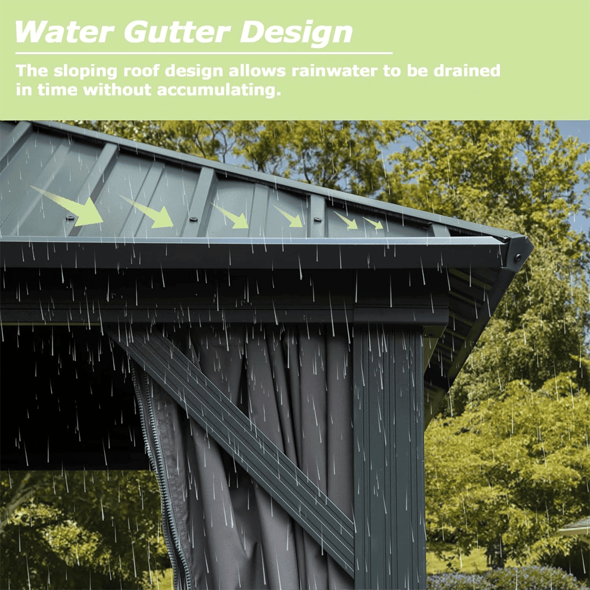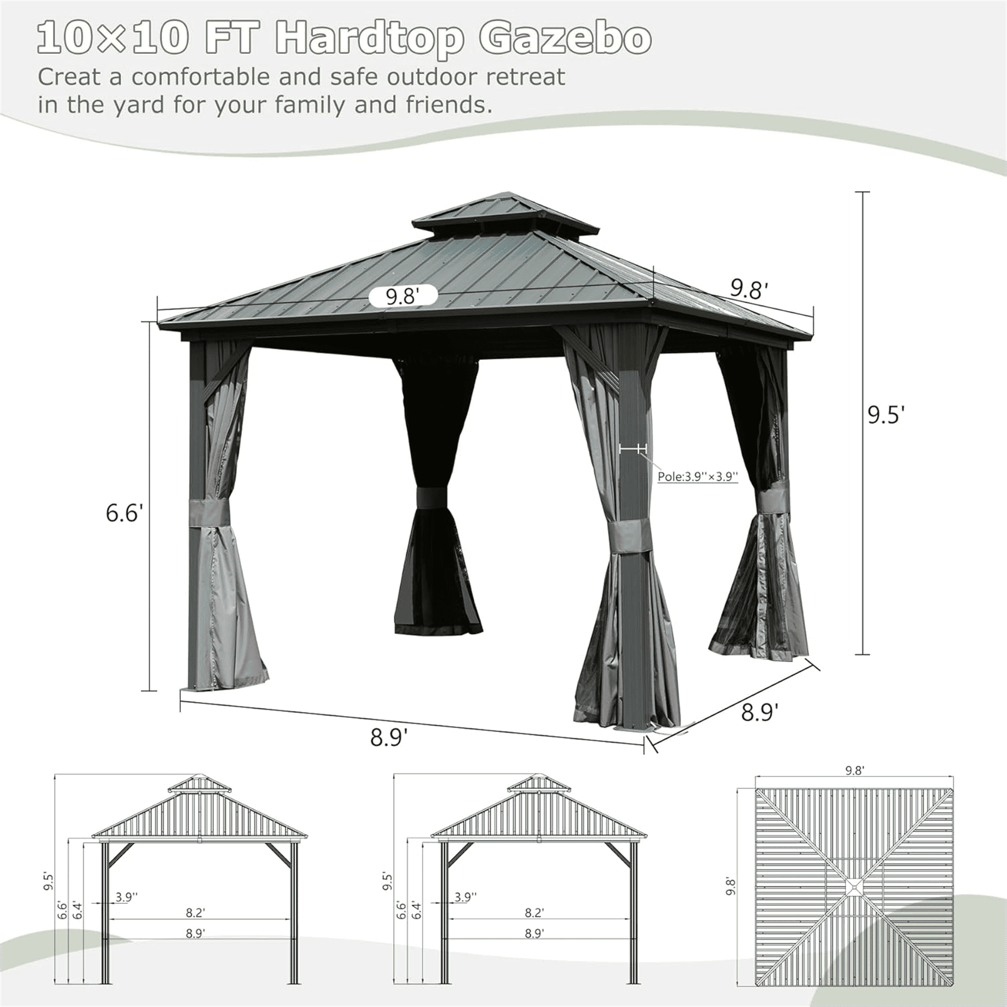 Double Roof Design- The space between the two roof layers allows air to circulate, creating a ventilation system that helps keep the gazebo cool and comfortable even on hot summer days. Plus, the slope of the roof helps rain and snow to flow down and off the structure, reducing the risk of damage and ensuring a long-lasting, durable roof.