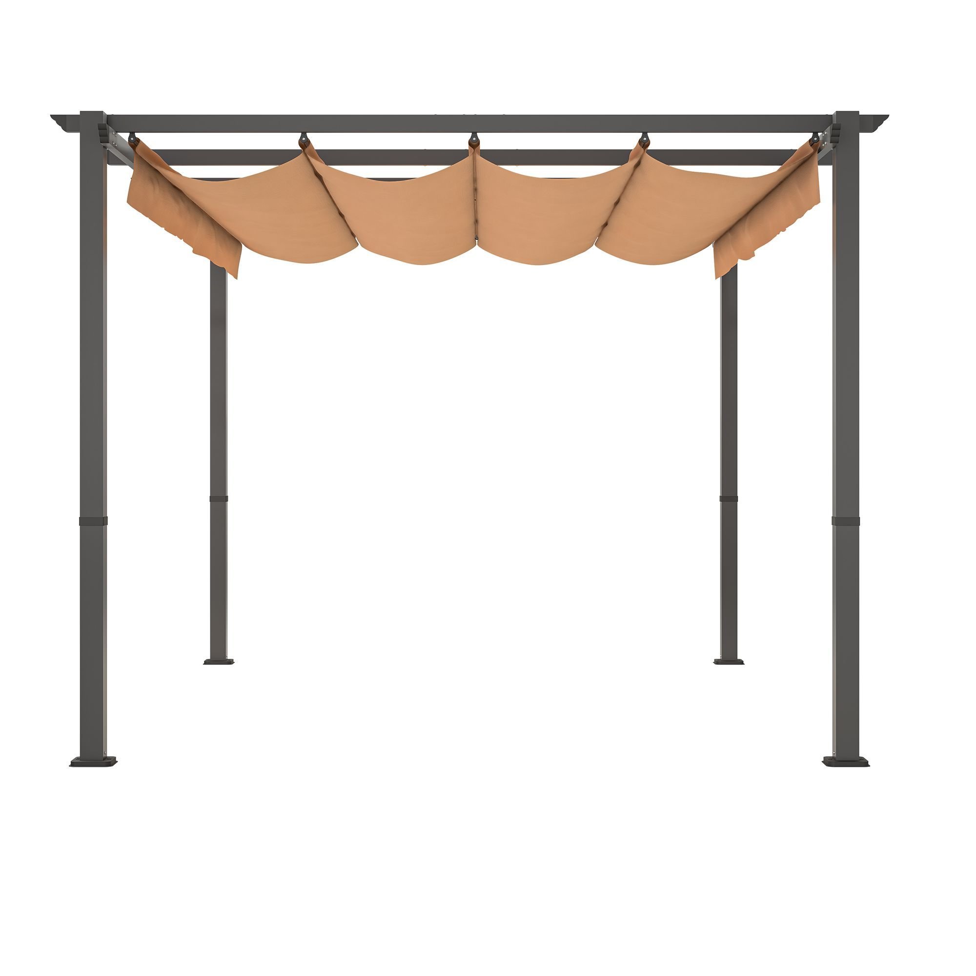 Spacious and Durable: Our patio pergola with retractable canopy has a 10' x 10' footprint – it provides plenty of elbow room for several occupants, but it's still able to fit within tight outdoor spaces such as patios or small yards. The frame on this pergola is mainly aluminum, which is lightweight but very strong. Plus, it's got a protective coating that enhances overall durability.