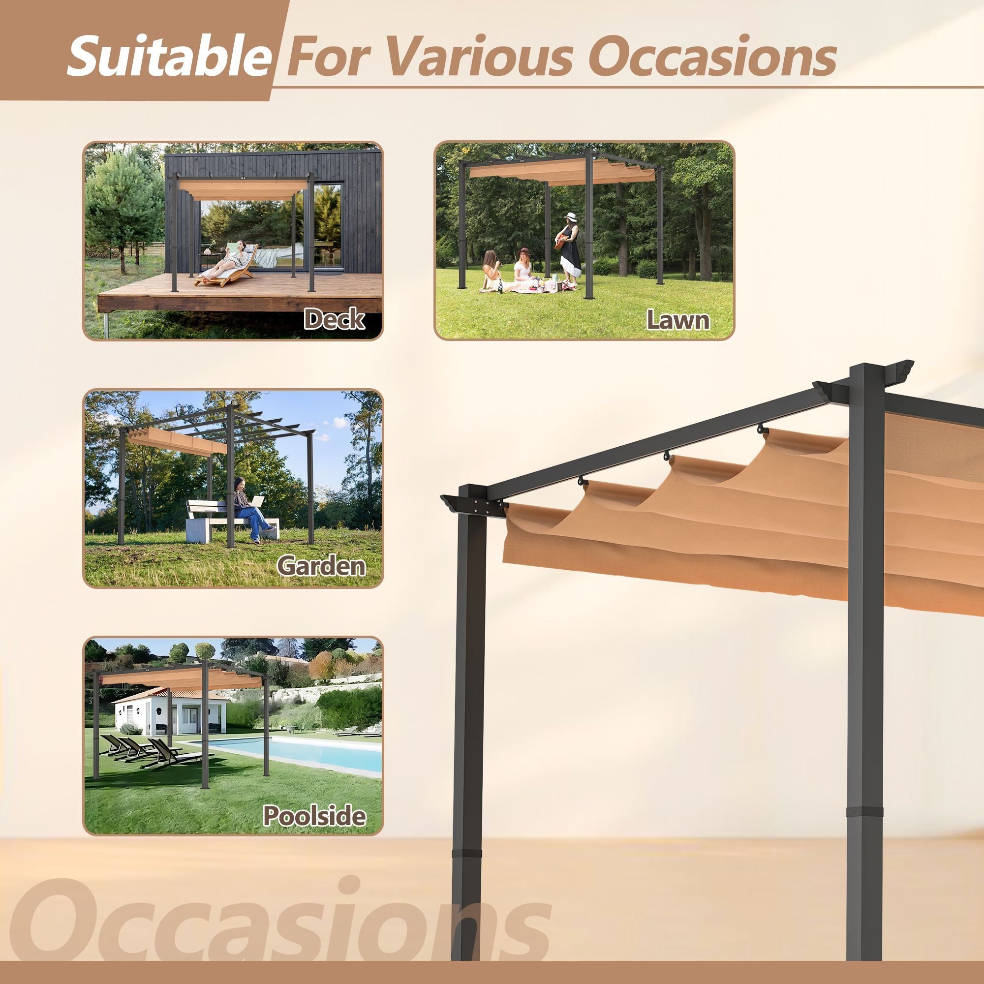 Versatile: Mount our metal pergola to soft or hard spaces. Whether you want to put a retractable pergola in your backyard or on a concrete patio with stakes and expansion screws, you have the option for either.