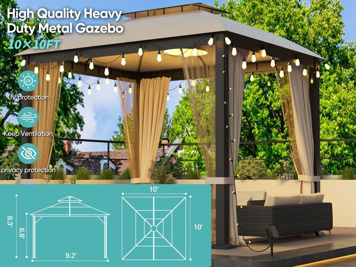 [Top-Quality and Maximum Protection]::This gazebo roof consists of approx 10'x10' weather-resistant polyester waterproof fabric,,ensuring reliable protection in all weather conditions (UV protection of 100%,Snow load 1800 lbs.). Designed for year-round use, the garden gazebo impresses with a 100% waterproof roof, which is also can be fireproof and ventilated. Hook load 50 pounds that can be used to hang electric lights or fans.