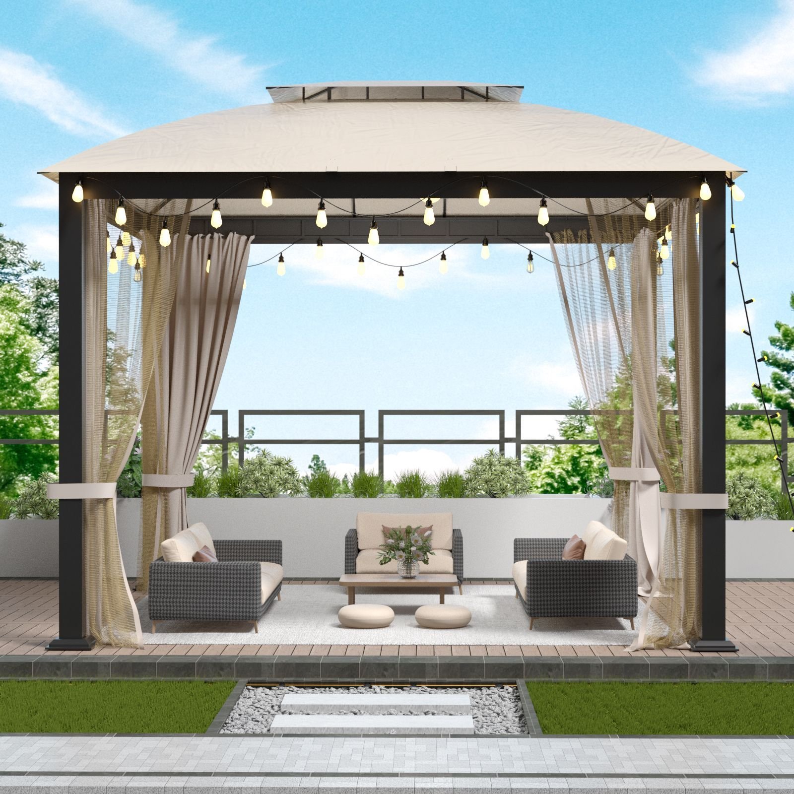 [Elegant, Incredibly Sturdy, and Safe]:The outdoor gazebo boasts a fully UV, corrosion, and weather-resistant galvanized steel frame frame and rust-proof stainless steel screw, ensuring a robust and first-class construction. The approximately 3.15x3.15 inch thick posts stand firmly on the ground. Crafted with high-quality, galvanized iron columns (80x80mm) and powder-coated crossbeams (18x18mm).This gazebo boasts exceptional durability.