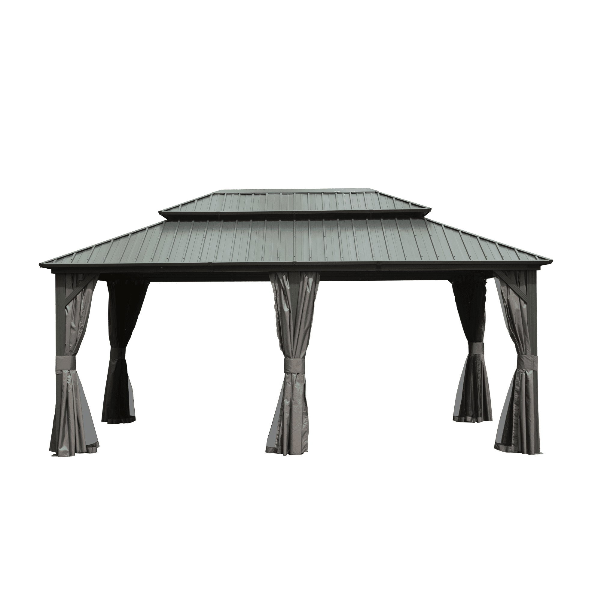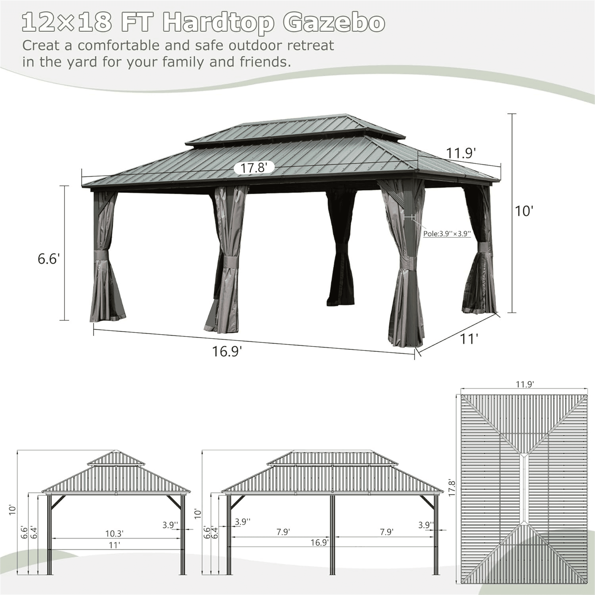 Double Roof Design- The space between the two roof layers allows air to circulate, creating a ventilation system that helps keep the gazebo cool and comfortable even on hot summer days. Plus, the slope of the roof helps rain and snow to flow down and off the structure, reducing the risk of damage and ensuring a long-lasting, durable roof.