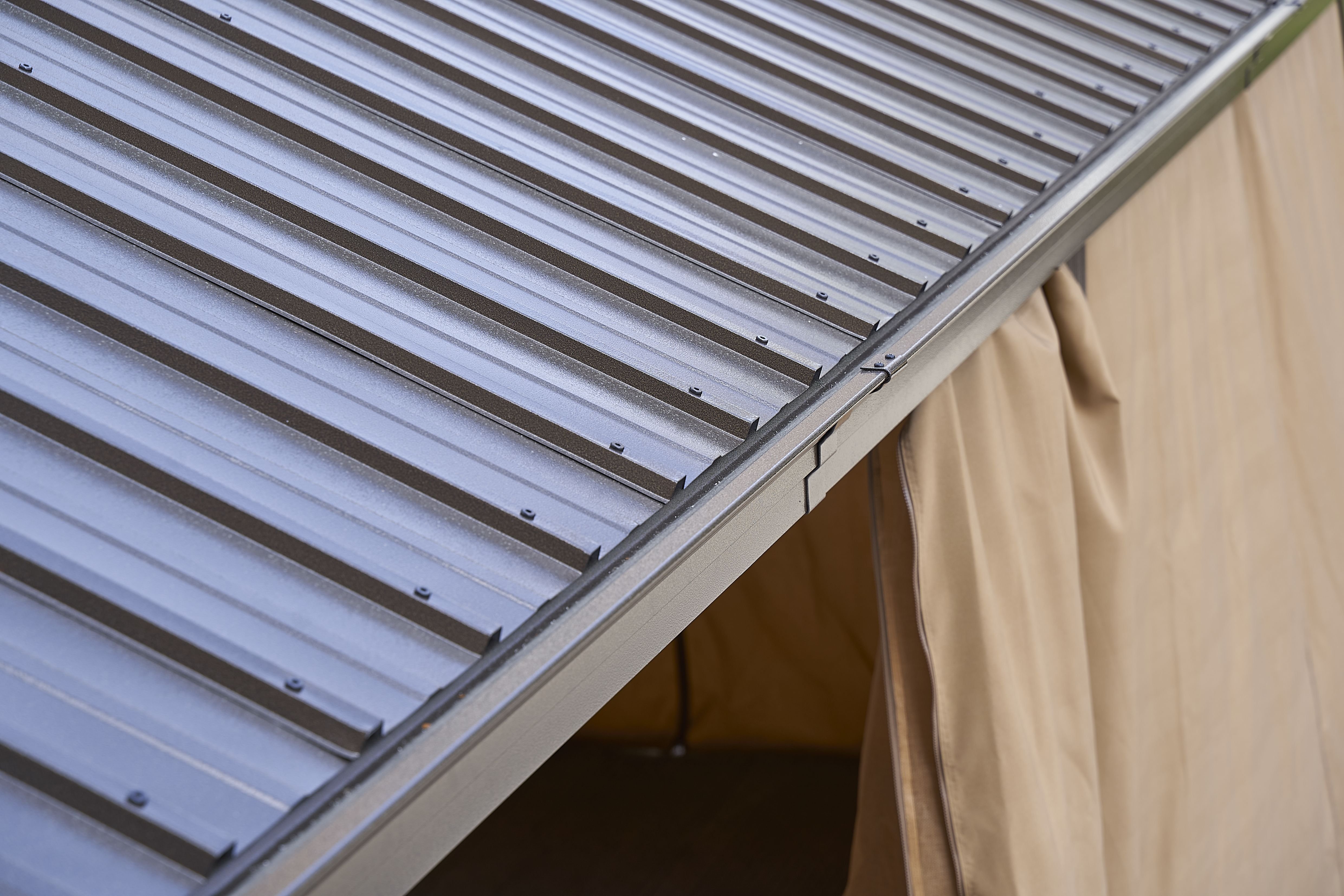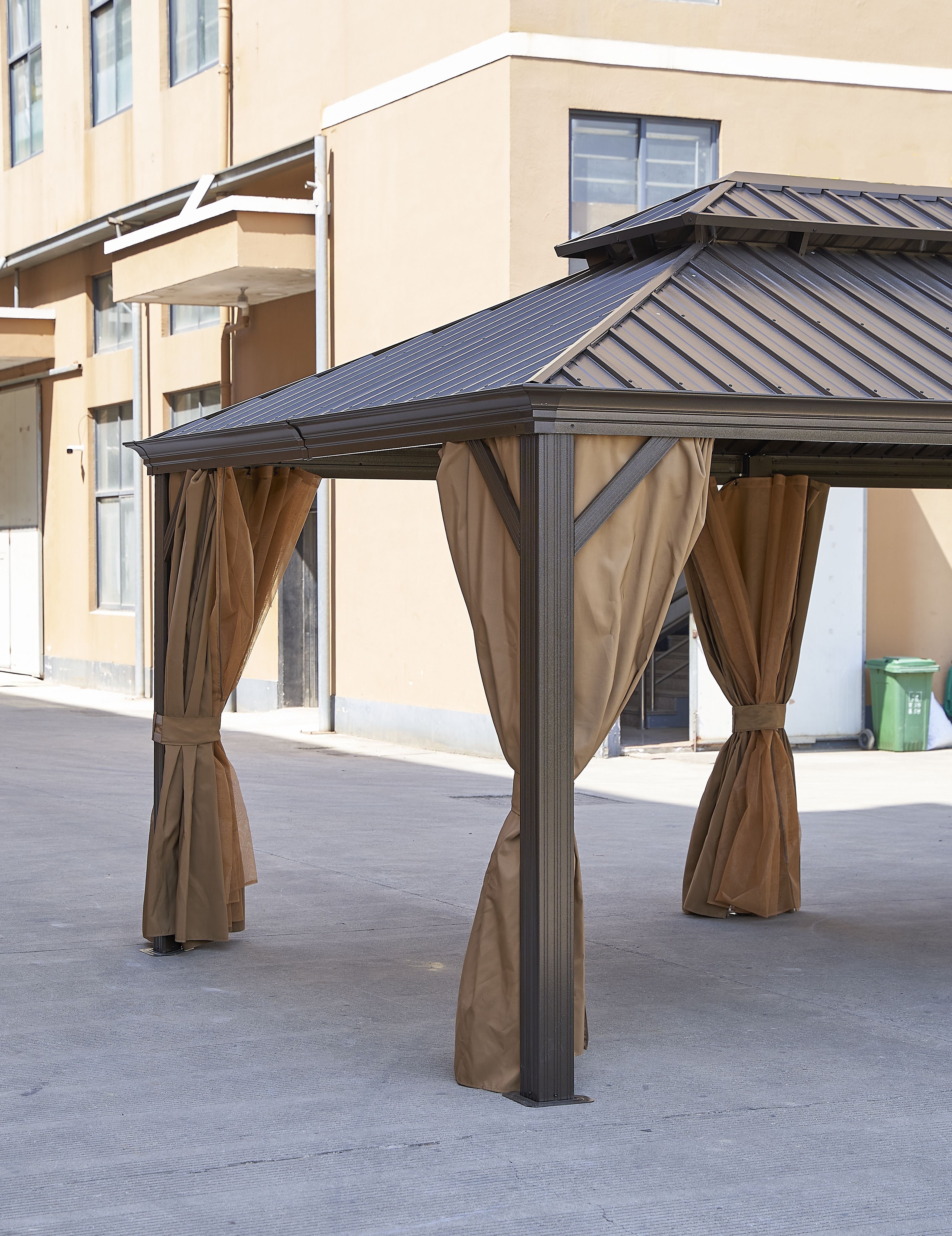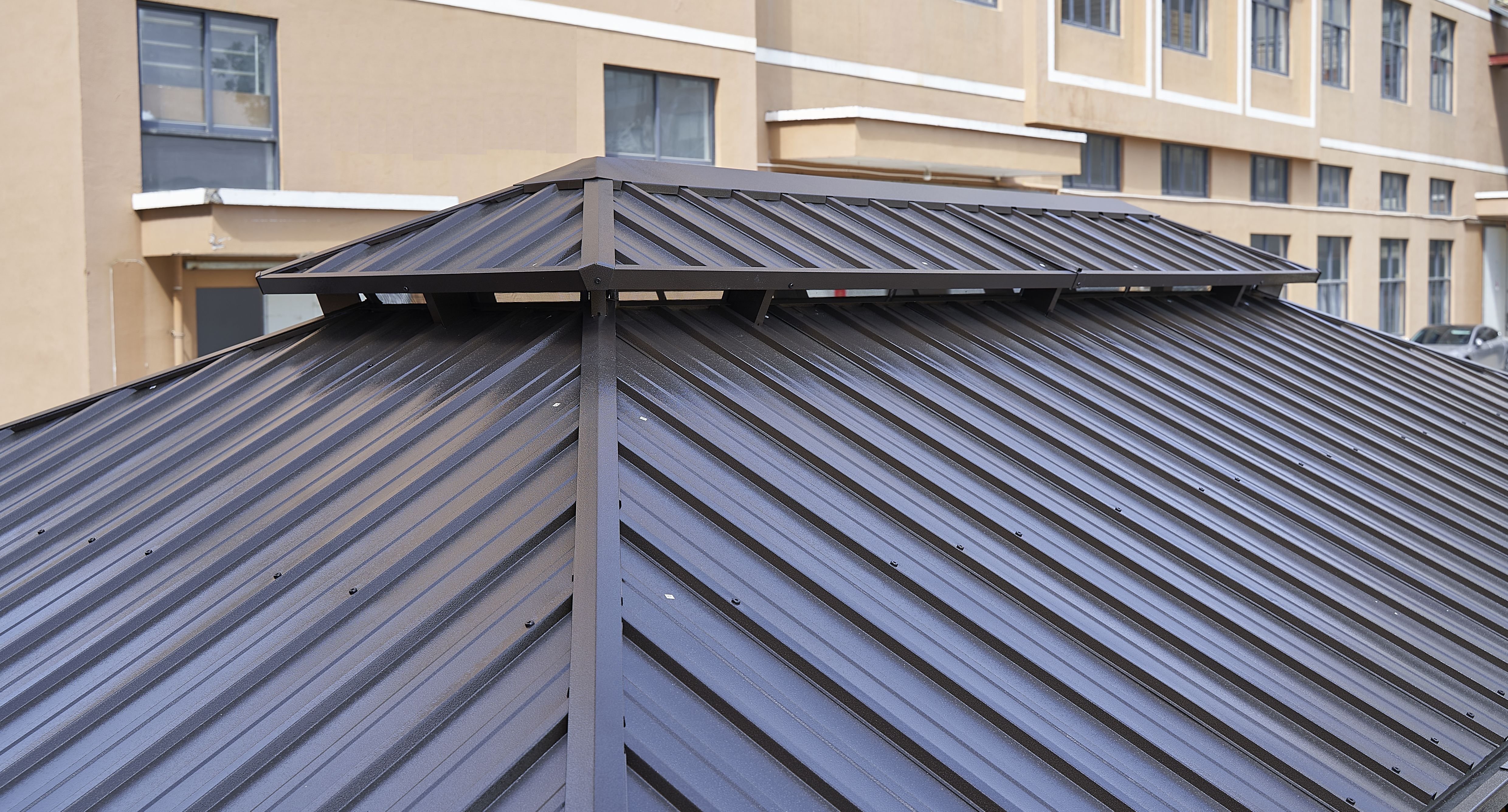 the double-roof hard top is made of galvanized steel, and the frame is made of aluminum. Our permanent patio gazebo is applicable all year round with its weatherproof, fade-proof, and rust-proof features.