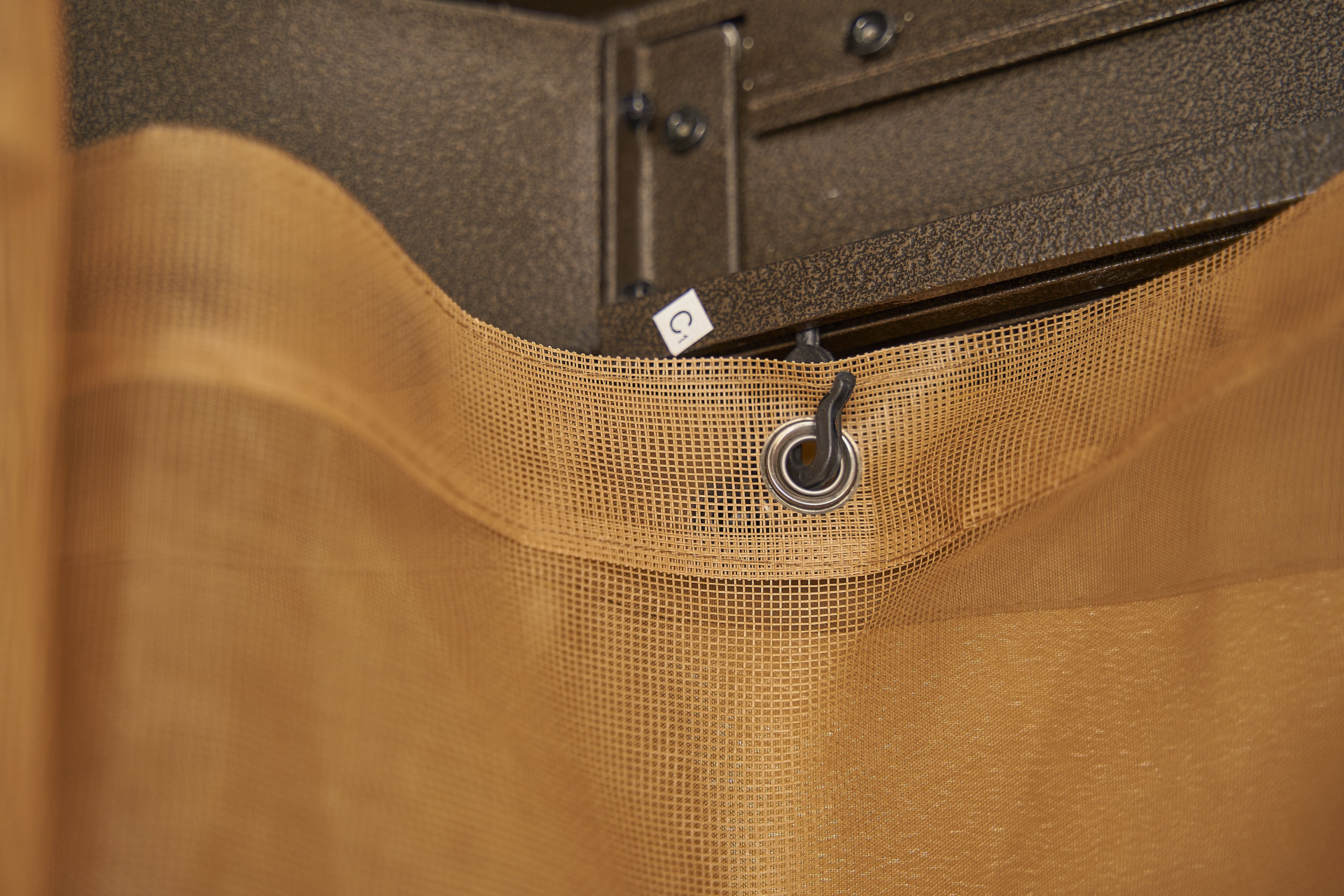 Double-tiered roof with metal net to circulate air and block leaves and mosquitoes.