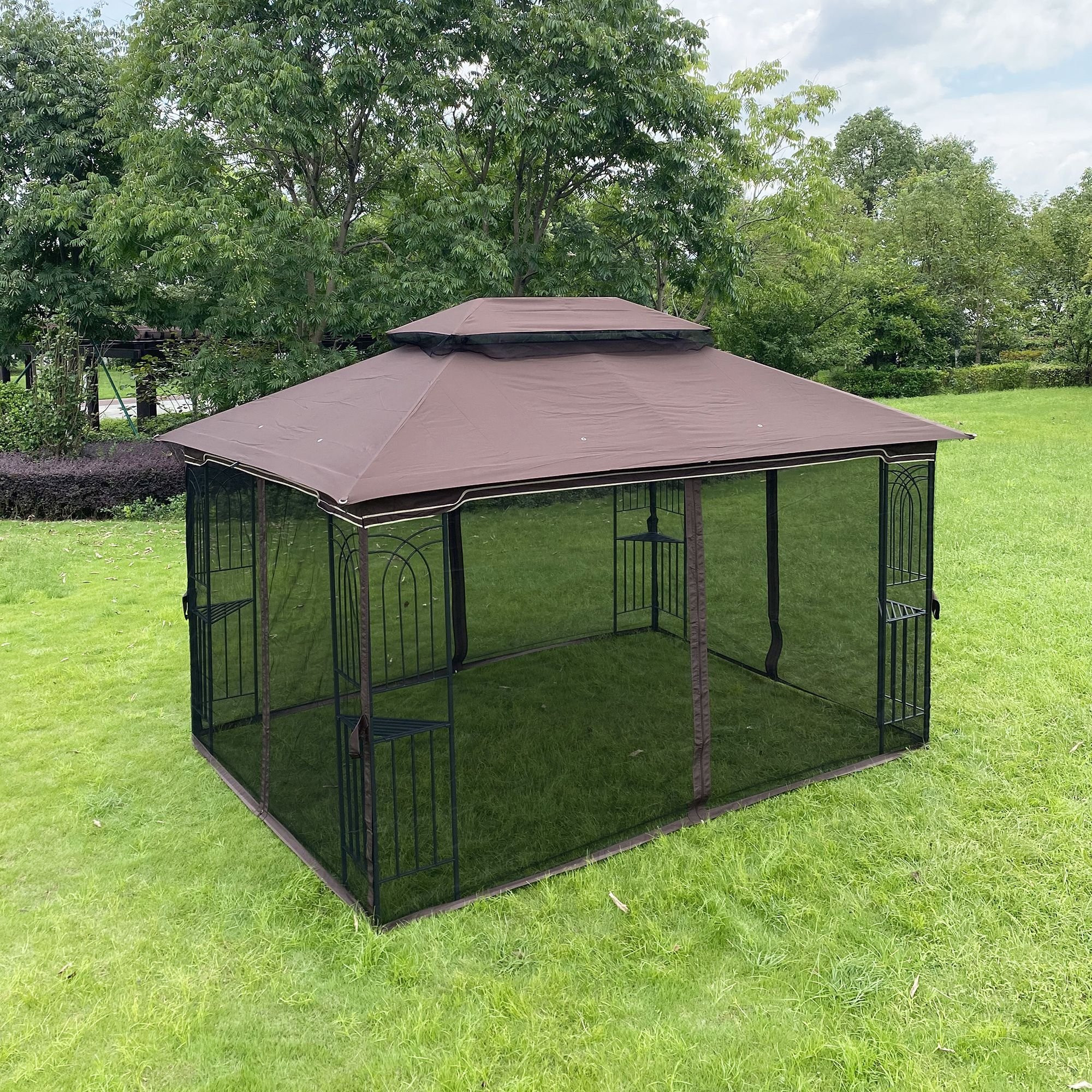 This 13x10Ft gazebo provides spacious space and is fitted with four-sided mesh for insect protection and wind and rain protection.With it you will enjoy a comfortable and relaxing courtyard life with your family and friends.