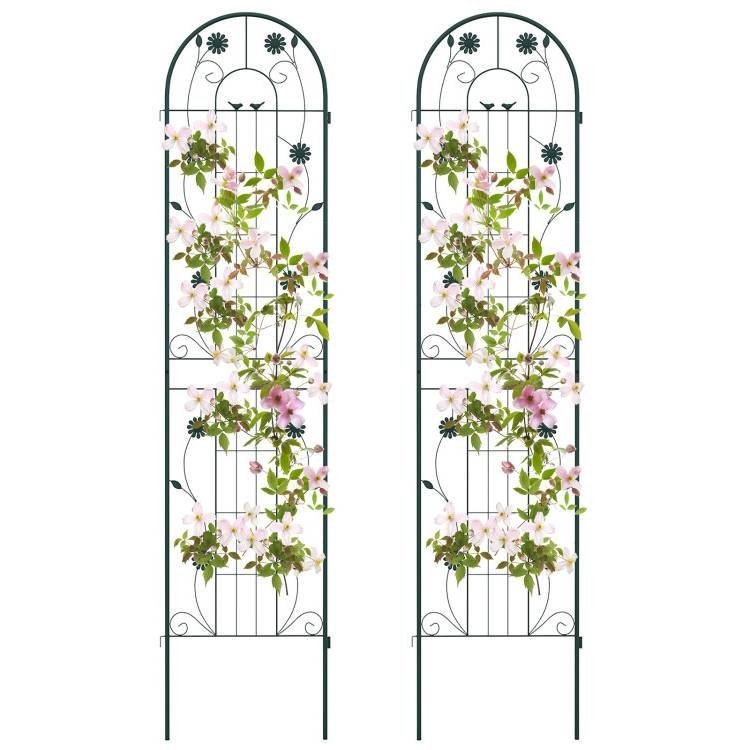 This 2 Pack - 7-ft Galvanized Steel Outdoor Garden Trellis in Green Metal Finish is constructed of galvanized steel, ensuring unrivaled sturdiness and rust resistance to hold heavy plant for longer time. The trellis features 10.5", 11" long legs, allowing for effortless insertion into the ground, providing a stable foundation. With impressive heights of 71", the metal trellis offers an expansive area for your climbing plants and vines to reach new heights. By providing an abundance of vertical space, your plants can thrive as they eagerly stretch towards the sun's nourishing rays. Apart from being used as a plant support for climbing plants. The 2 pack trellis set can be combined with a garden fence, ensuring the protection and privacy of your cherished plants. Plus, you can connect 2 or more trellis in an A-shape frame for growing cucumbers or other climbing vegetables. Designed with enchanting birds, flowers and leaves, the tall garden fence will effortlessly add a touch of timeless elegance and retro charm to your garden, lawn, or yard. Moreover, you have the freedom to arrange more trellises to different layouts according to your unique requirements. Coming with complete components and a detailed instruction manual, the assembly process of the wire lattice grid panel is a breeze. Besides, the 2 pack fence trellises are designed with an effortlessly interlocked connector, allowing for quick setup.