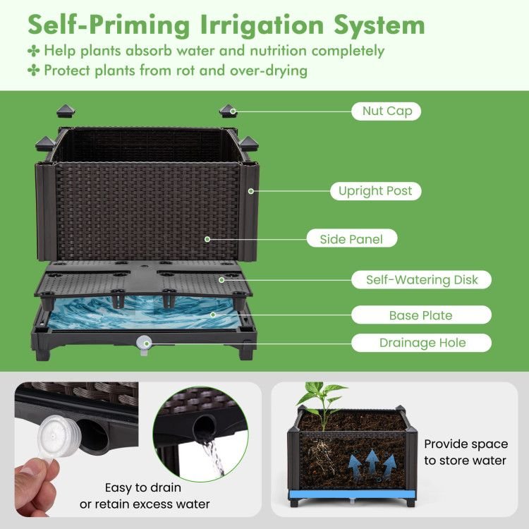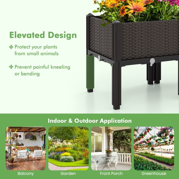 The raised garden bed kit is designed with 8 elevated legs and 2 planter boxes, allowing you to freely combine the garden boxes as you desire,It is made of premium PP materials that are durable and weatherproof for long-lasting indoor and outdoor uses. Moreover, the PP materials are designed with rattan patterns, adding a sense of beauty and elegance to your space. More importantly, the elevated planter kit requires no tools for effortless assembly, just insert walls into the base plate and insert the columns along grooves of sideboards, and you can choose whether to install the elevated legs for different purposes. More than that, it is equipped with a self-watering disk, a water storage box, and drainage holes for self-priming irrigation, allowing roots to aerate while having moisture nearby. Besides, the elevated design is space-saving for planting vegetables, fruits, flowers, or herbs in the garden, patio, or backyard.