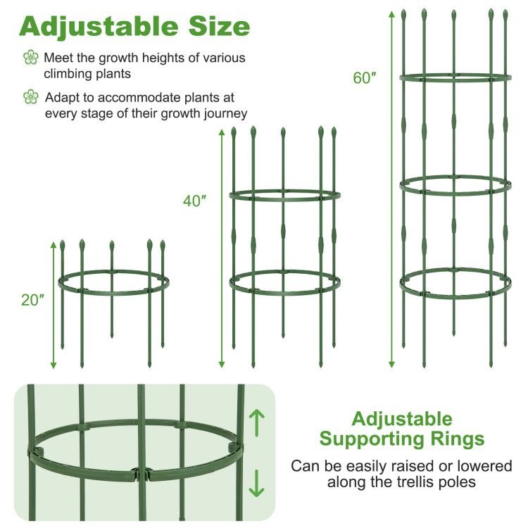 2.Adjustable Size: The 40"/60" tall plant support trellis comes with 2/3 height options-20"/40", 20"/40"/60", which meet the growth heights of various climbing plants, and adapt to accommodate plants at every stage of their growth journey. Additionally, the trellises can also be combined to create even taller sizes. And the supporting rings can be easily raised or lowered along the trellis poles.