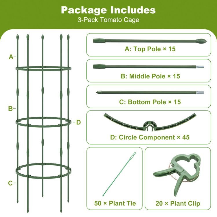 -Package includes (60"): 3-Pack Tomato Cage, A: Top Pole x 15, B: Middle Pole x 15, C: Bottom Pole x 15, D: Circle Component x 45, 50 x Plant Tie, 20 x Plant Clip