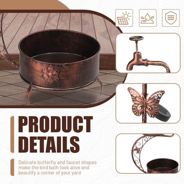 Elevate your garden's charm with this beautifully designed 36 inch vintage metal bird bath. This multifunctional birdbath not only provides a serene spot for birds to drink and bathe but also features a solar-powered lamp that adds a warm, inviting glow to your garden at night. The base doubles as a planter, allowing you to enhance the bath's beauty with your favorite flowers. Crafted from durable, rustproof metal, this bird bath is both a practical and decorative addition to any outdoor space, making it a perfect haven for birds and a delightful focal point for bird lovers.