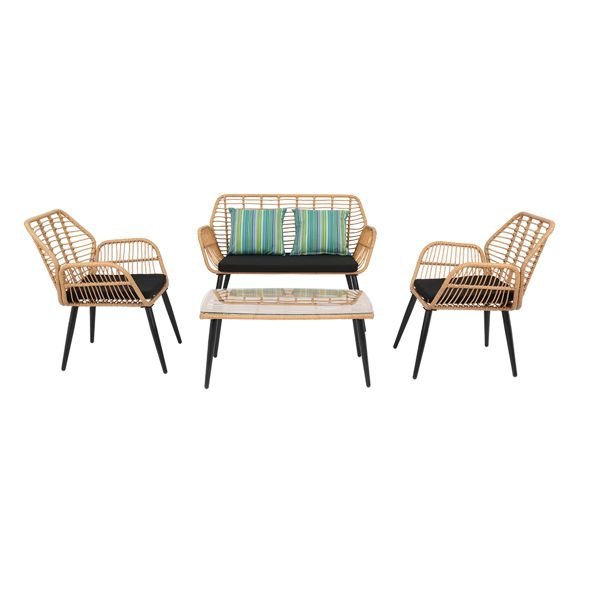 Enhance your outdoor living space with our 4-Piece Patio Furniture Outdoor Bistro Set, a perfect amalgamation of style, comfort, and durability. Designed to fit seamlessly into any backyard, balcony, or deck, this all-weather rattan set invites you to enjoy leisurely conversations, morning coffees, or tranquil evenings under the stars. Featuring a cozy loveseat, two single chairs, and a sleek table, this set provides a comfortable and stylish setting for any outdoor gathering or intimate moment.