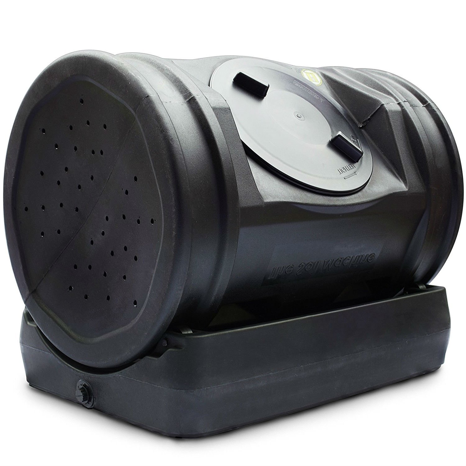 Please welcome the 52-Gallon Compost Bin Tumbler Composter - 7 Cu. Ft.. This little guy is the scaled down version of its 12 cubic foot kin. The Jr. holds 7 cubic feet of compost and sits on a wheeled base. The handles now provide better grip to make turning even easier. The 12-inch twist off lid keeps your compost safely closed off but is easy to remove and even doubles as an extra turning point. The ends feature aeration holes which provide much needed airflow for the compost batch with the option of drilling more for those who live in areas with low air currents. The wheeled base allows owners to turn the bin effortlessly and can easily be separated to allow the bin to roll freely from place to place. The low profile ensures that it stays out of sight and won't be blown over in high winds like other tumbler composters. The resin material used to mold the bin is 100% recycled and the rich dark color absorbs the sun's heat keeping your compost at a nice hot temperature. Comes fully assembled and requires little maintenance. Just turn once a week and after addition of new material and you can see compost in as little as 14 days. Help keep organic waste out of our landfills by getting a Compost Wizard Jr. today.