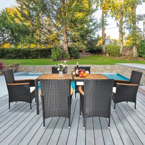 Enjoy outdoor dining like never before with our 7 Piece Patio Dining Set, where comfort meets style in an exquisite outdoor setting, making every meal and gathering a memorable experience. This set includes a spacious table and six chairs, making it perfect for gatherings, meals, and relaxed conversations under the sky. The acacia wood table top and hand-woven rattan chairs complement each other, creating a nature-inspired ambiance that's both inviting and stylish.