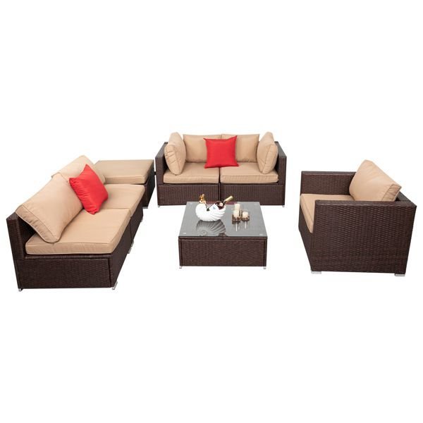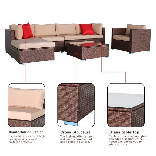 This 7 Pieces Wood Grain Patio PE Wicker Rattan Corner Sofa Set is a best choice for you. It's made of gray synthetic resin wicker and designed for the outdoors. It's of great furniture to decorate your garden. The classic yet simple design made it look great in any setting. This set is a beat useful furniture for you. It has comfortable sofas you can sit on it to enjoy your leisure time. The space saving design makes your garden delicate. You will like it so what are you still waiting for?