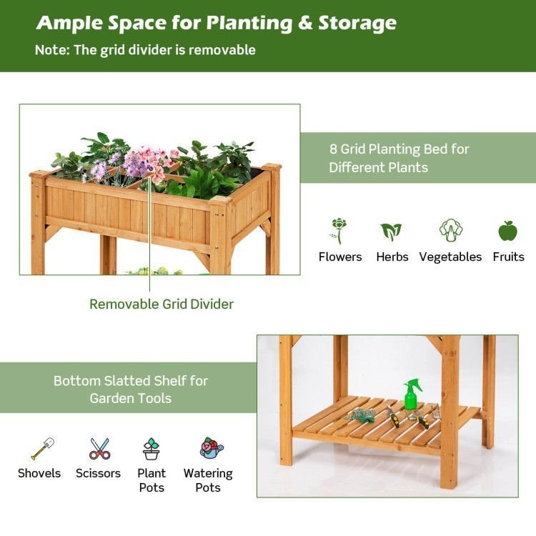 The user-friendly height of this planter can reduce stress on your back and knees during gardening work. The grids provide a separate area for growing up to 8 different herbs, flowers, or vegetables. And some of your gardening tools, pots and soil bags can be stored on the lower shelf. What's more, it is designed with drainage holes to drain out excess water conveniently. And the included fabric liner helps to keep the soil in place and retain the nutrients. This planting bed is both nice-looking and durable enough for use over many seasons.