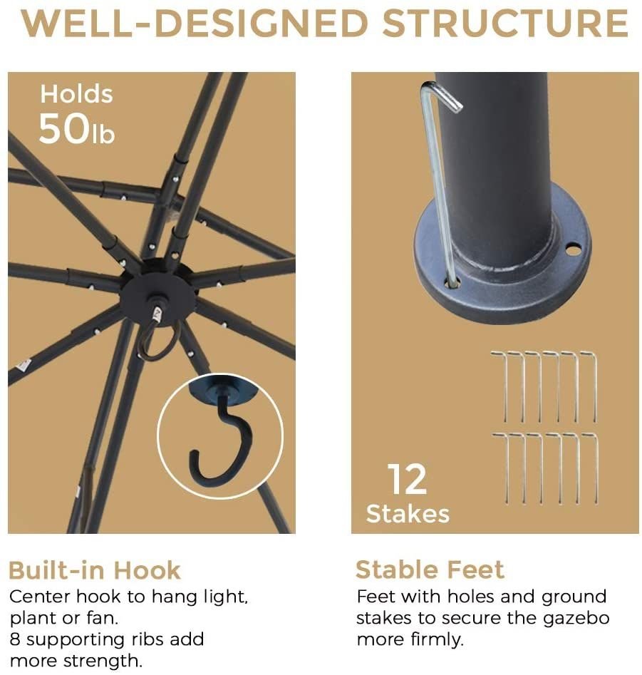 Extra Large Outdoor Gazebo: Oversized outdoor gazebo: 10'*12' canopy provides oversized diameter space for shade and rain. The whole pergola tent can accommodate 6~9 people. Let you enjoy cool and comfortable with your family and friends on hot summer days.
