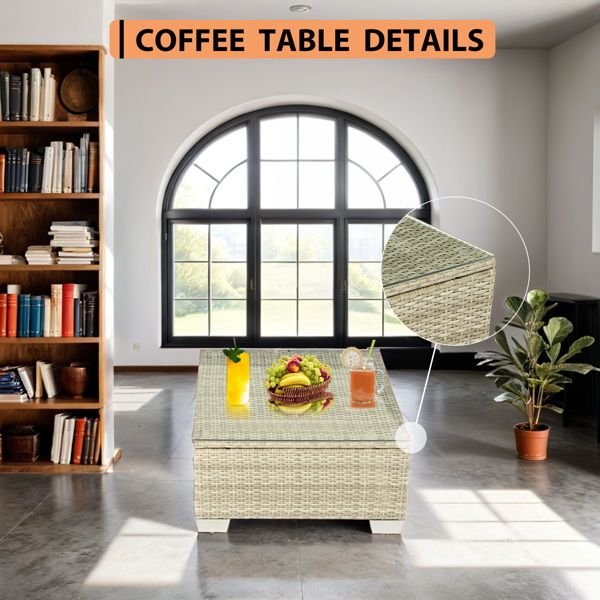 [EASY TO CLEAN AND MAINTAIN]Our outdoor patio furniture tempered glass table top and steel frame support the stability and balance of the sofa.The steel frame is made of Q195 stainless steel, not easy to deform, tear and rust. Removable tempered glass table top, easy to wipe and clean, zip cushion covers are made of high quality fabric, fade-resistant, waterproof and washable.