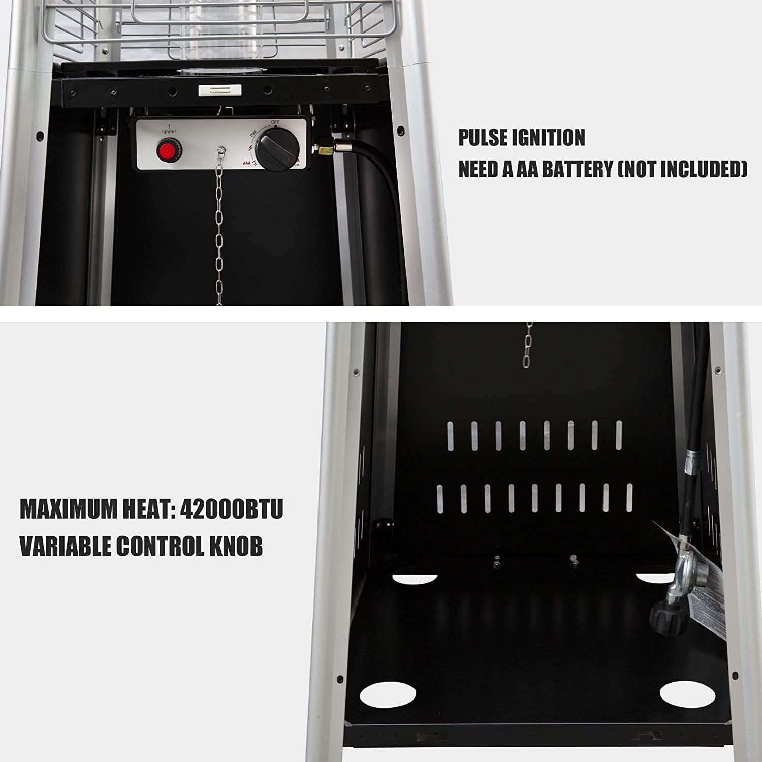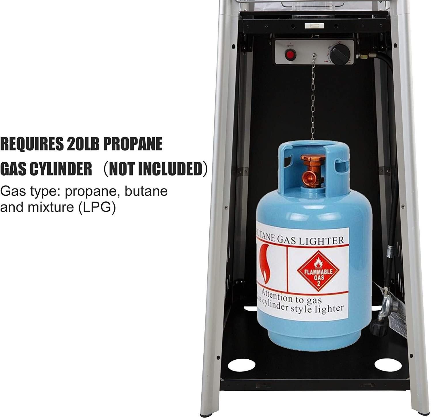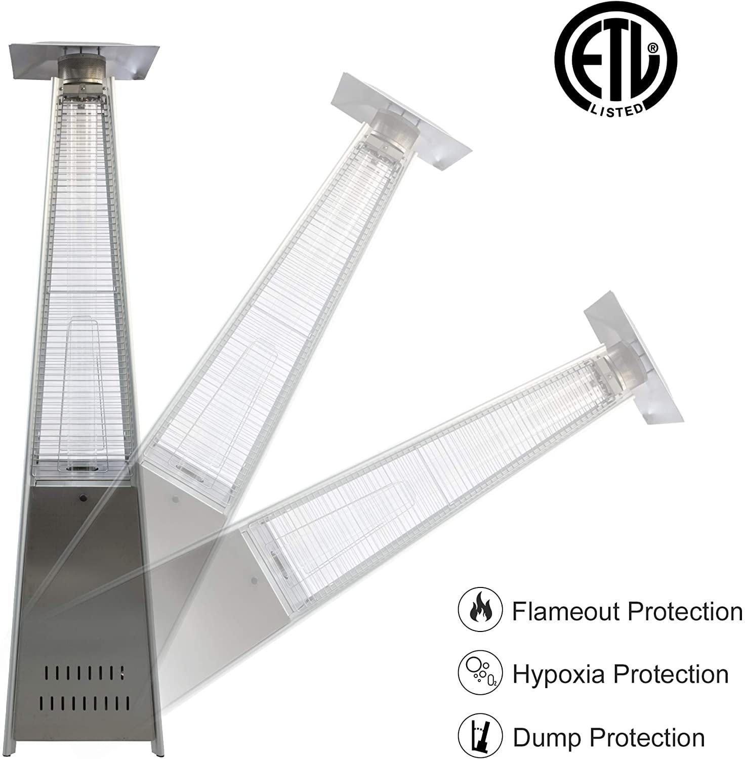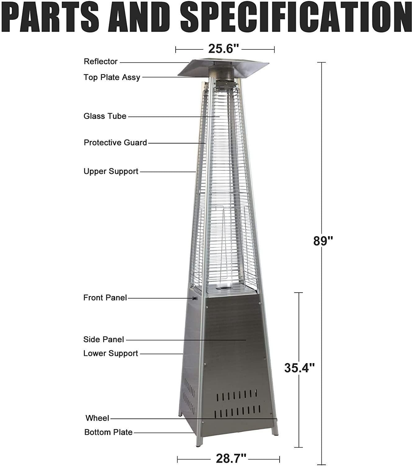 Heating Area | 42,000 BTU burner heats up to 200 sq ft, the heat is transferred upward through the explosion-proof glass tube and radiated by the top reflector, heating up quickly and smoothly.Applicable | Suitable for 20lbs standard propane cylinder tank (tank not included), gas type: propane, butane and mixtures (LPG), this heater is best used with propane gas.Safety & Certified | The heater adopts anti-tilting design and has an automatic closing device, the pyramid-shaped design is more stable. This heater certificated by CE and ETL.Adjustable Heat | Ignition method: pulse ignition, power range: 5-13KW, can meet different heating needs, equipped with wheels, it can move to the required position at will.Assembly | Pyramid heaters require two people to assemble, and gloves are required to prevent accidents during installation. Be sure to read the installation instructions before installation.
