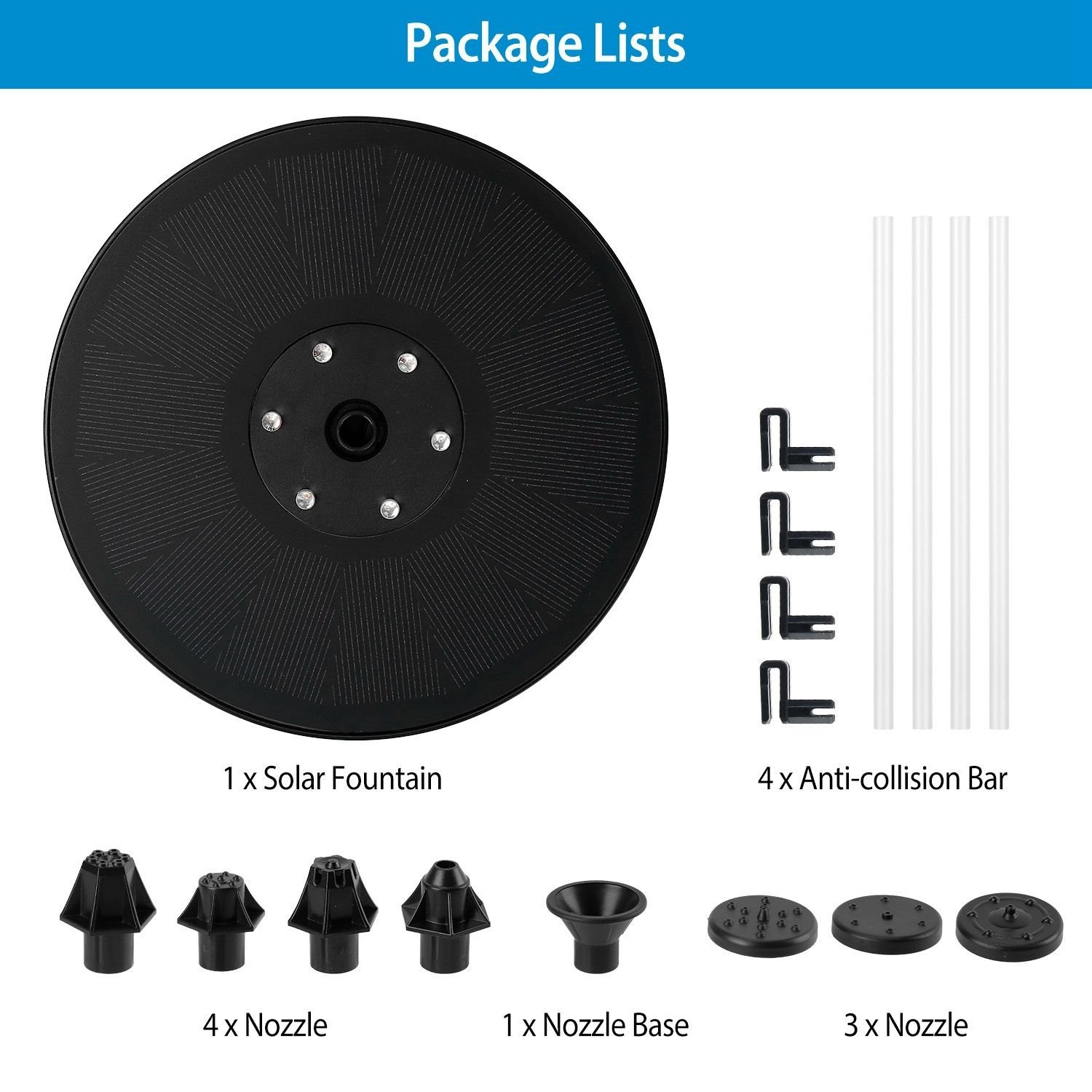 1.Our solar bird bath fountain comes with 7 nozzles of different spray pattern, which allows you to choose different water fountain patterns easily