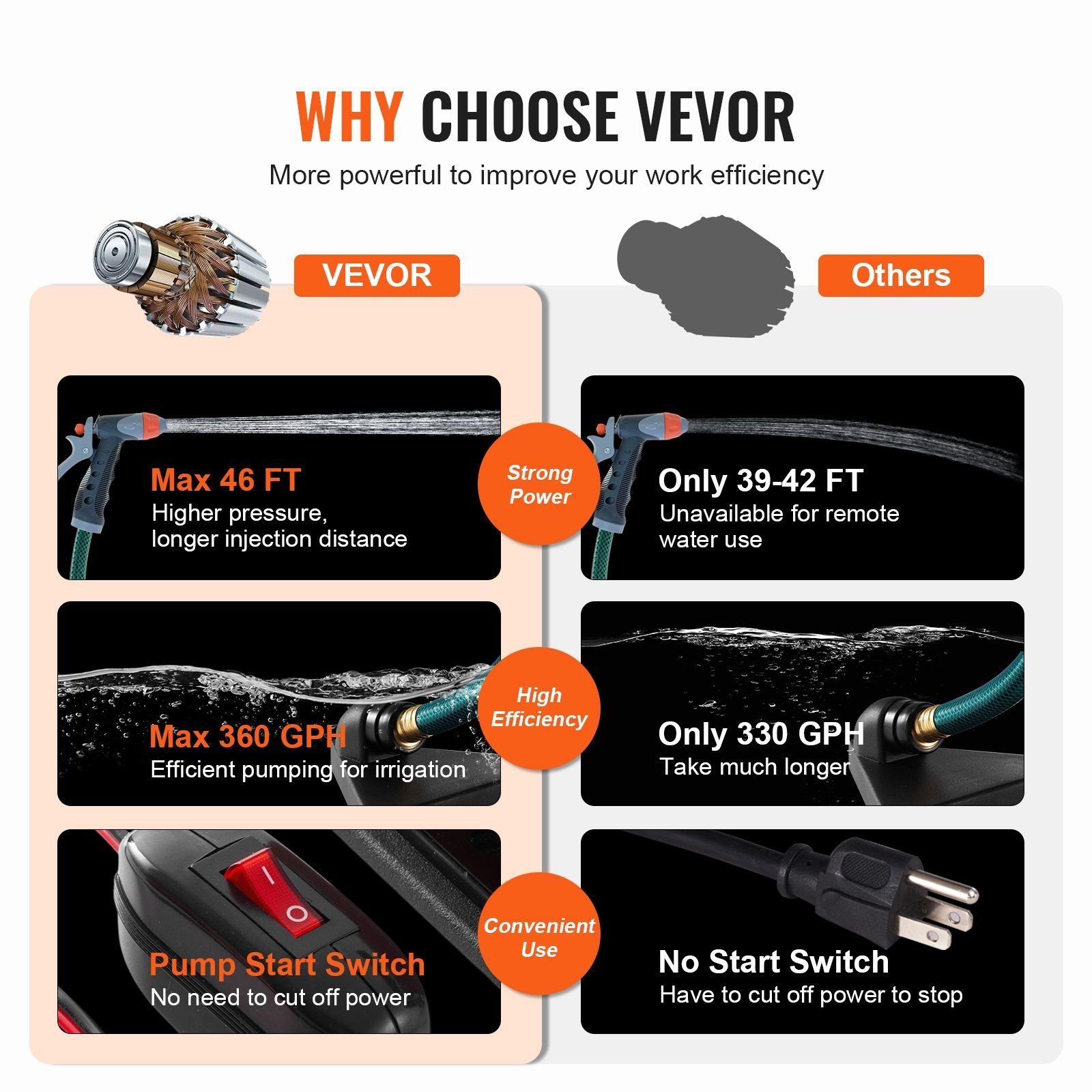 With a powerful 1/10 HP motor, the transfer water pump provides a large 360 GPH flow and 46 ft head lift. No water transfer problem will be a challenge for you.