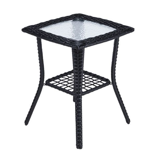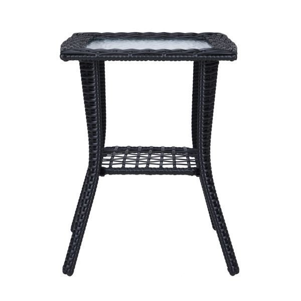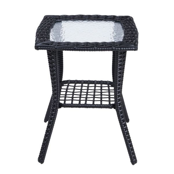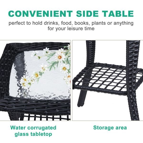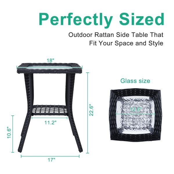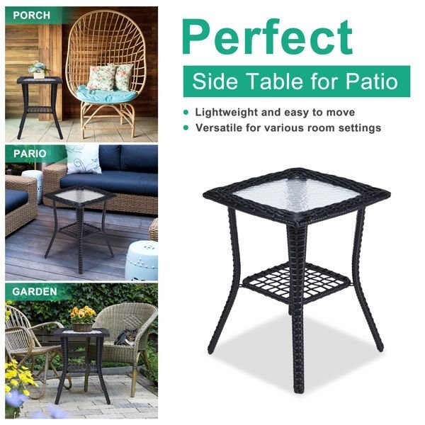 Elevate your living space with our Outdoor Wicker Side Table, a perfect blend of style and functionality. Designed for both indoor and outdoor environments, this table showcases a sophisticated hand-woven wicker pattern paired with a unique water ripple-patterned tempered glass top. Constructed with a durable powder-coated steel frame and all-weather wicker, it guarantees longevity and resilience against the elements. The table's two-tier design not only enhances its visual appeal but also offers ample storage space. With easy assembly and a versatile design, this side table is an essential addition to your garden, porch, balcony, or living room.