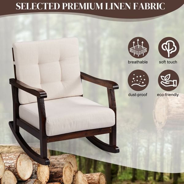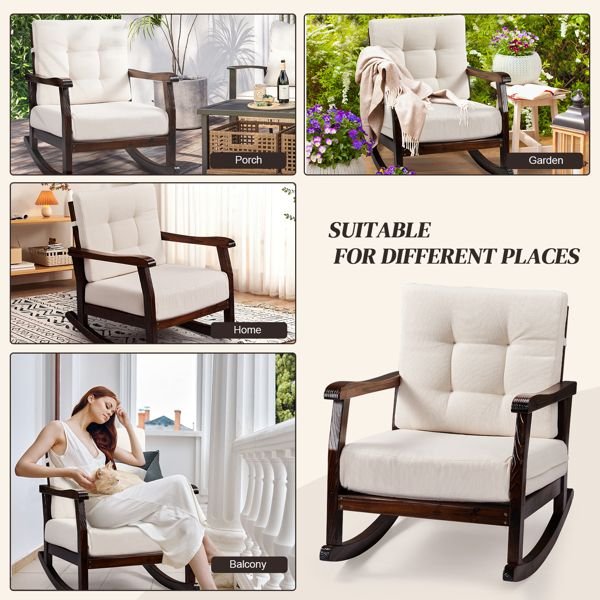 Experience the ultimate in relaxation with this Outdoor Wood Rocking Chair. Featuring wide curved armrests, and thick, plush cushions, this rocker invites you to unwind and enjoy the soothing motion of a perfectly balanced rocking chair. The ergonomic design cradles your body in comfort, while the soft, detachable cushions provide an extra layer of coziness. Whether you're reading, or enjoying your morning coffee, this solid wood rocking chair is the perfect addition to your patio, porch, or backyard, offering a serene escape from the day's stresses.